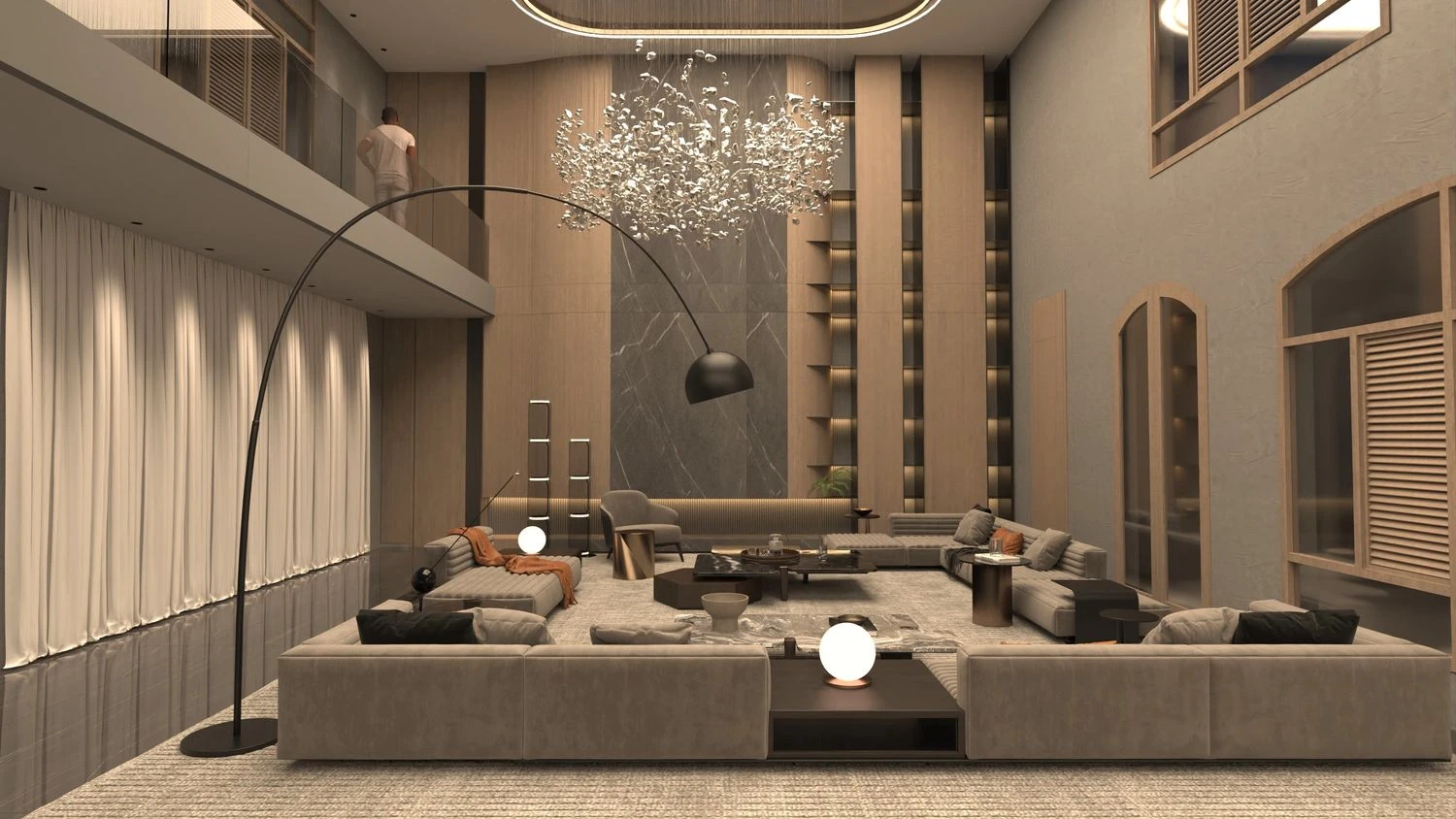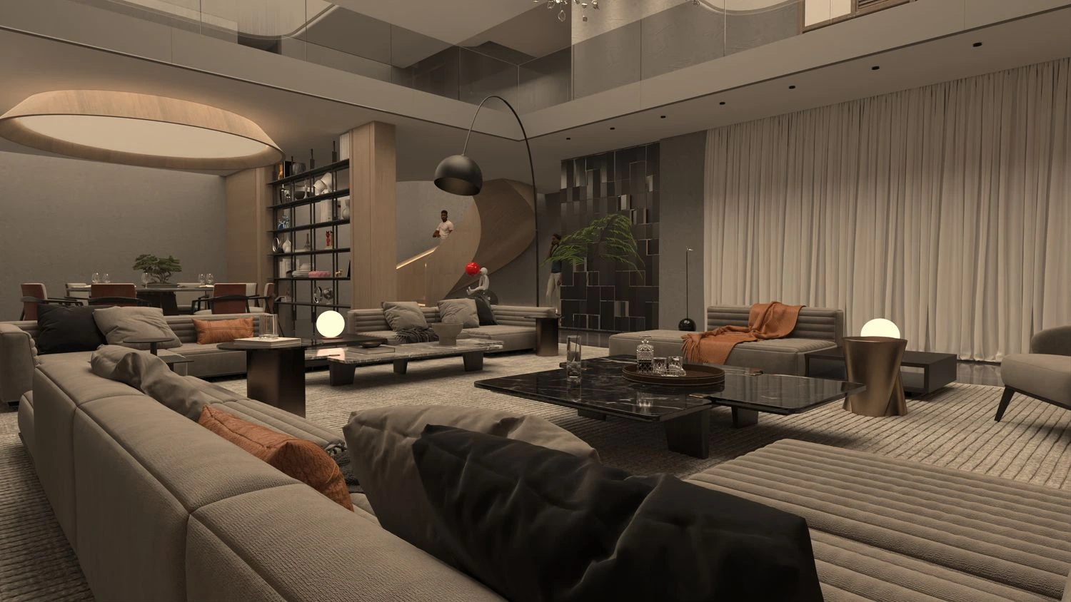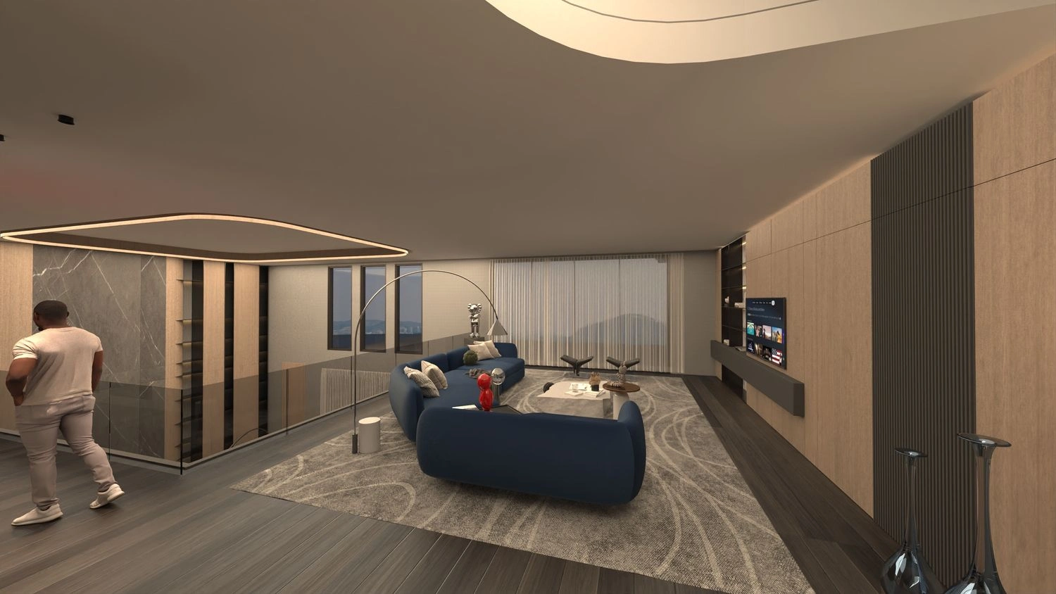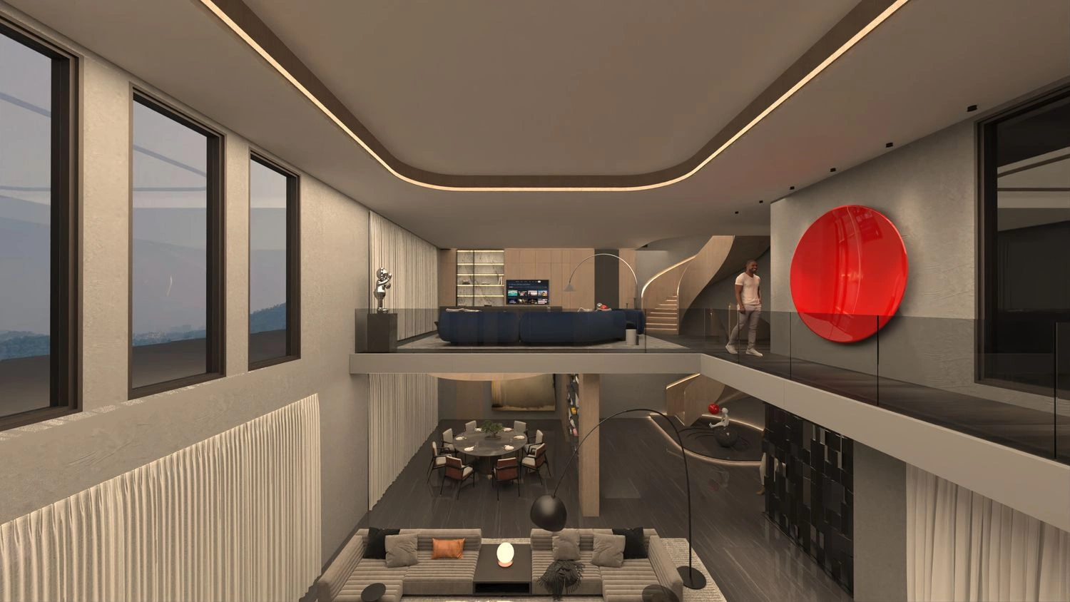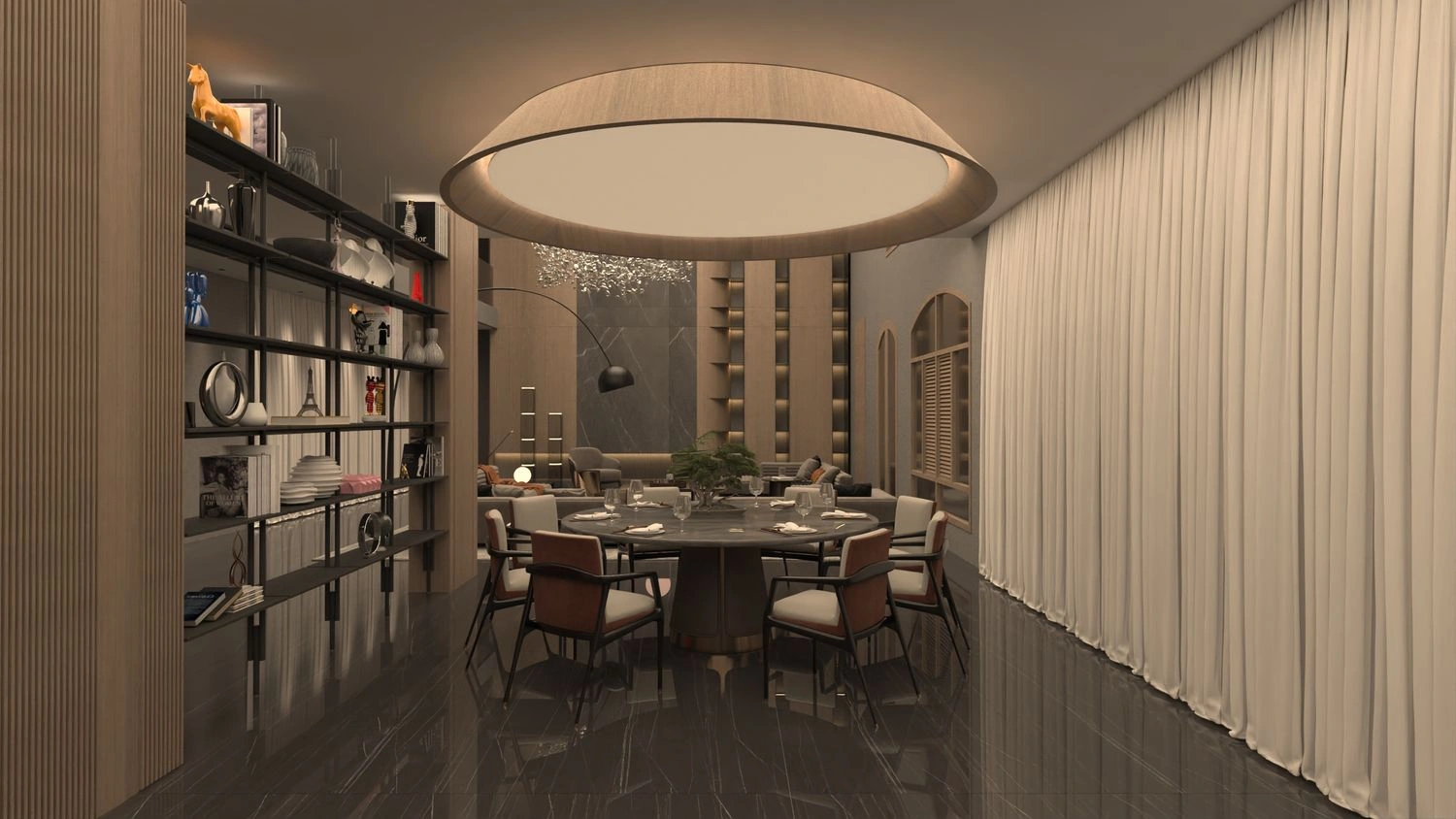 This villa features a striking double-void space, allowing the living room on the first floor to overlook the salon area on the ground floor, creating a sense of openness and grandeur. At the heart of the design is an elegant spiral staircase, a sculptural masterpiece that connects the levels seamlessly. The entrance is spacious and inviting, offering a clear view of the round dining room, which adds a unique and sophisticated touch to the layout.Additionally, we designed a private suite for the villa owner, comprising a bedroom, a walk-in closet, and a bathroom, all situated in its own secluded section of the villa. This ensures complete privacy and luxury while maintaining harmony with the rest of the home’s open and interconnected design.