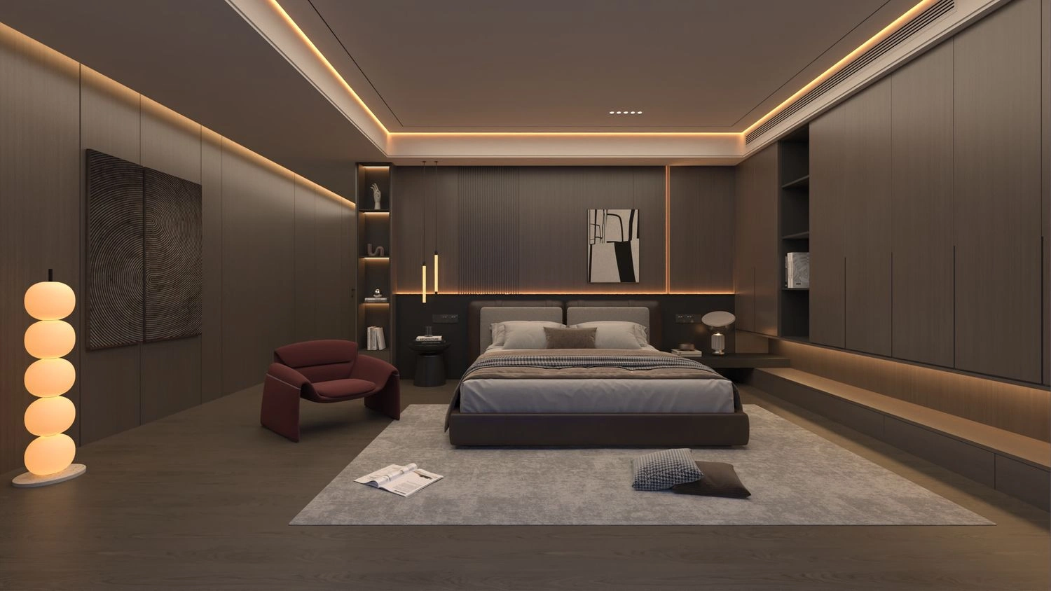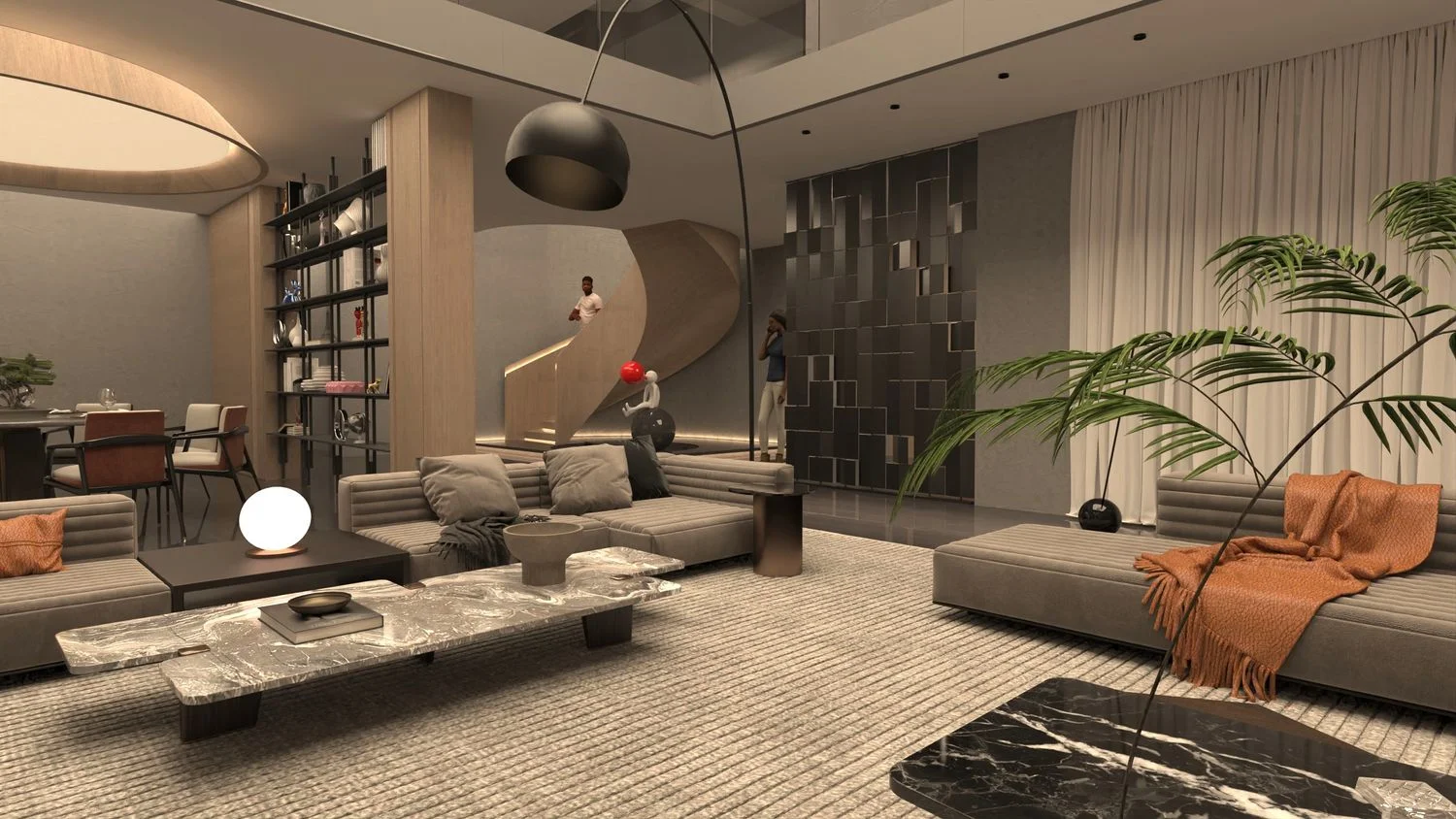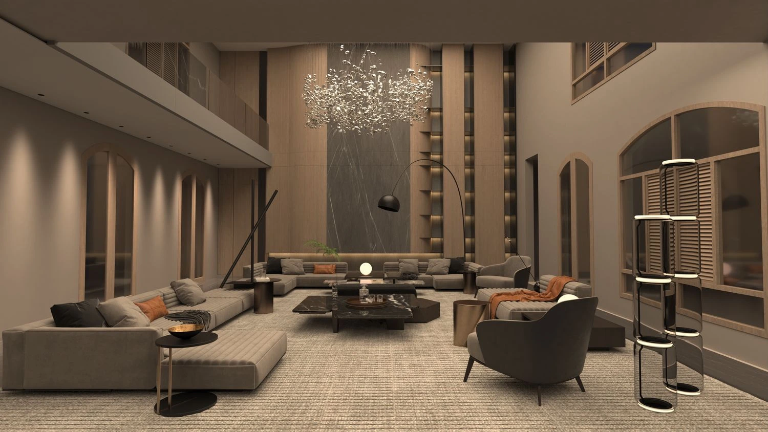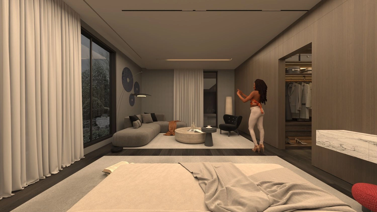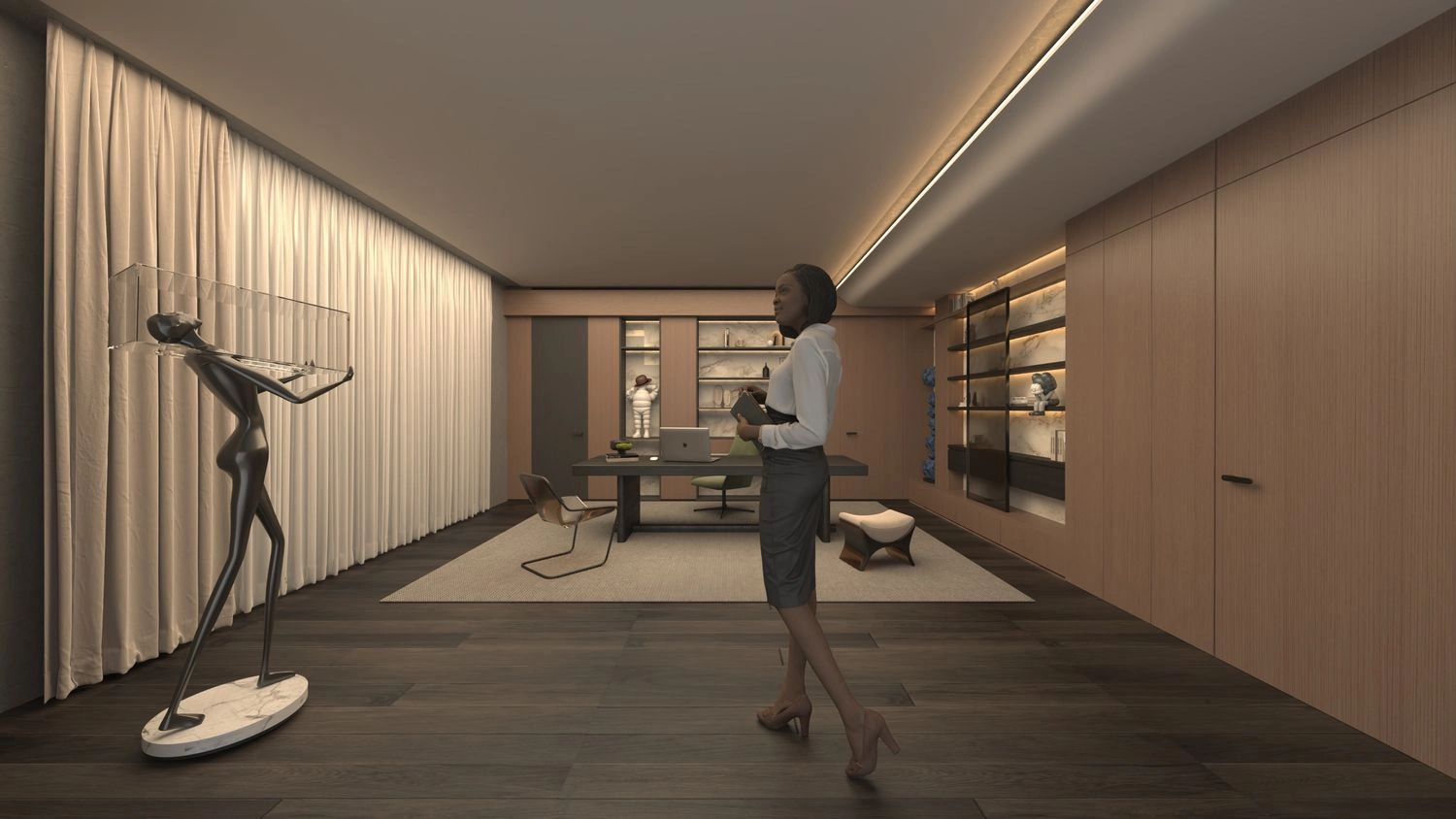 This villa features a striking double-void space, allowing the living room on the first floor to overlook the salon area on the ground floor, creating a sense of openness and grandeur. At the heart of the design is an elegant spiral staircase, a sculptural masterpiece that connects the levels seamlessly. The entrance is spacious and inviting, offering a clear view of the round dining room, which adds a unique and sophisticated touch to the layout.Additionally, we designed a private suite for the villa owner, comprising a bedroom, a walk-in closet, and a bathroom, all situated in its own secluded section of the villa. This ensures complete privacy and luxury while maintaining harmony with the rest of the home’s open and interconnected design.