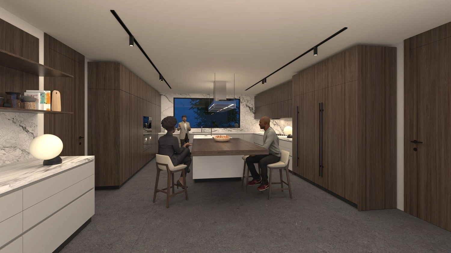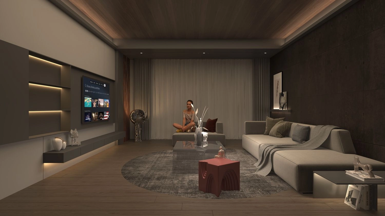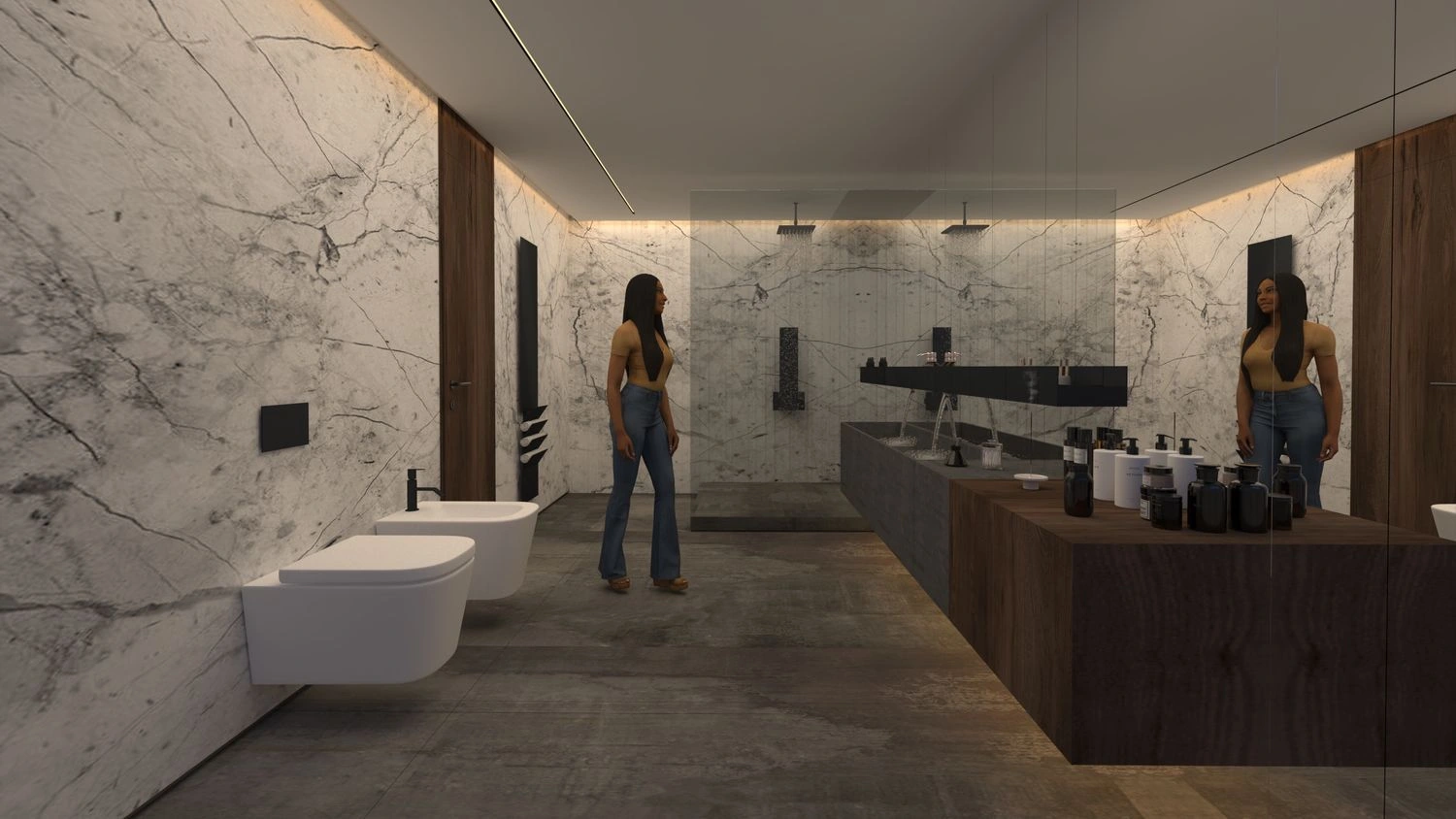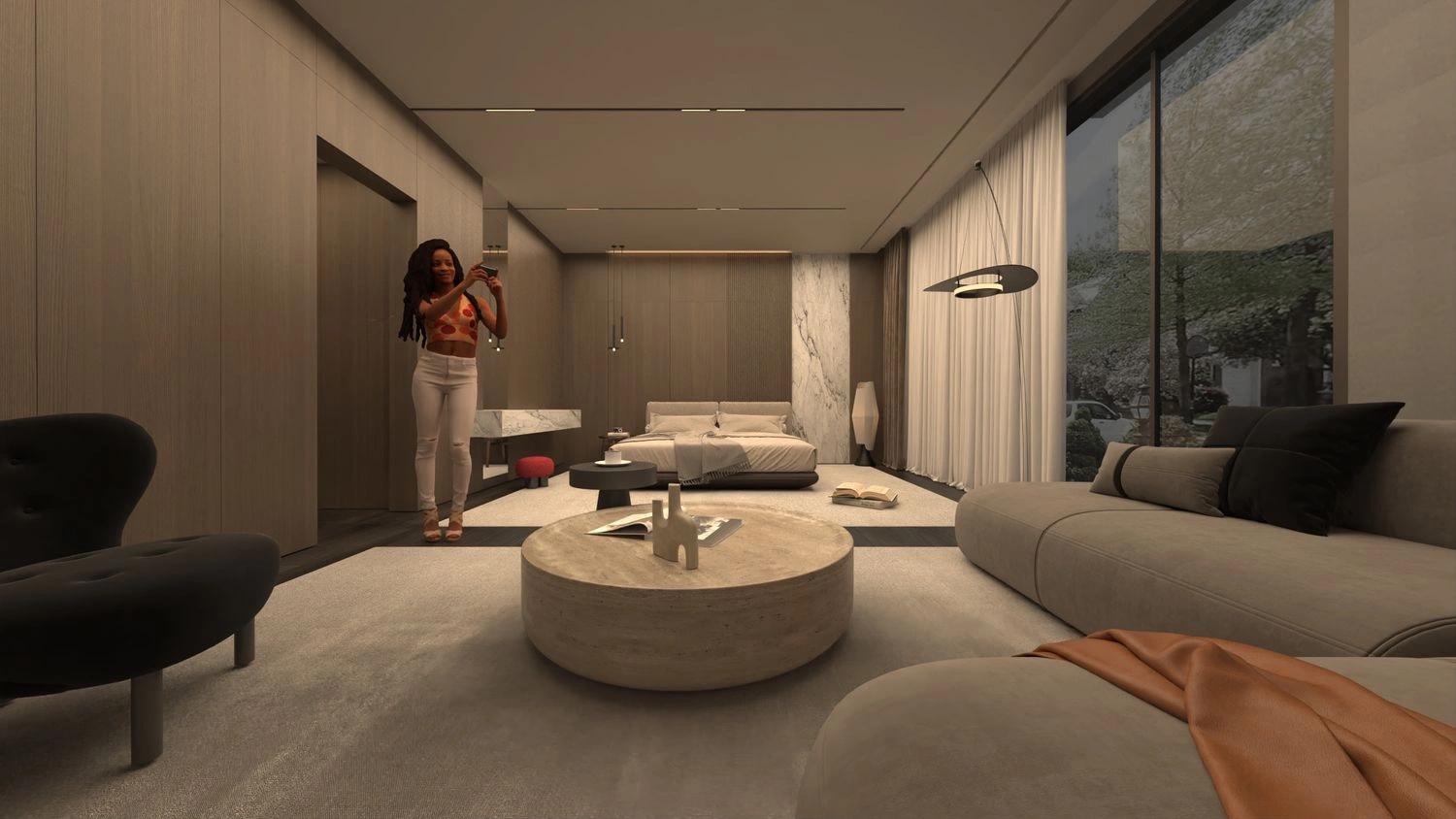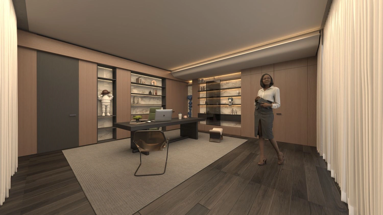 This villa features a striking double-void space, allowing the living room on the first floor to overlook the salon area on the ground floor, creating a sense of openness and grandeur. At the heart of the design is an elegant spiral staircase, a sculptural masterpiece that connects the levels seamlessly. The entrance is spacious and inviting, offering a clear view of the round dining room, which adds a unique and sophisticated touch to the layout.Additionally, we designed a private suite for the villa owner, comprising a bedroom, a walk-in closet, and a bathroom, all situated in its own secluded section of the villa. This ensures complete privacy and luxury while maintaining harmony with the rest of the home’s open and interconnected design.